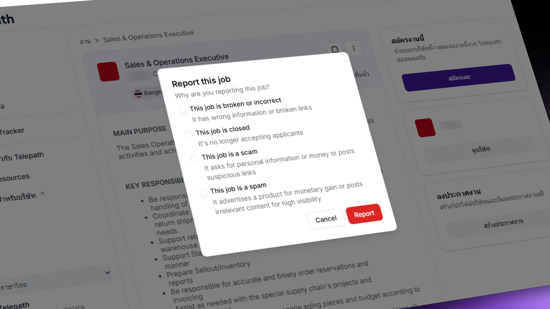 We've added a new feature to help keep the Telepath job board high-quality. You can now report a job post if you find it to be a scam, spam, or otherwise inappropriate. This helps us ensure that all listings are legitimate and valuable for our community.